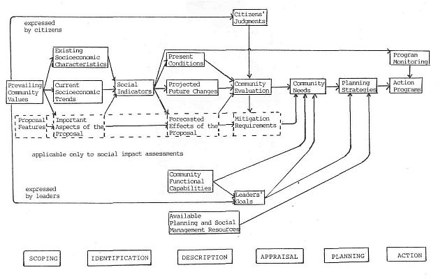 In die model val die totale proses van 'n gemeenskapsevaluering-studie uiteen in ses fases, te wete: "scoping, identification, description, appraisal, planning, action".