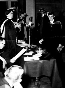 Links agter by mikrofoon is die Dekaan, Prof B F Nel