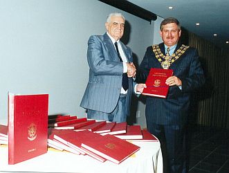 Prof Landman oorhandig 'n kopie van die geskiedenis van Verwoerdburg aan die burgemeester