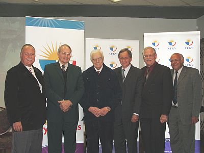 Ontvangers van oorkondes met prof. Landman en prof Kamper Vlnr: dr Frits Kok (Besturende Direkteur van die ATKV vir die afgelope 25 jaar) dr Henry Stone (voormalige Direkteur-Generaal van Onderwys in SA) prof W A Landman prof Gerrit Kamper Mnr Johan Lemmer (voormalige HUB van die Federale Onderwysraad van SA) Mnr Sakkie Kotze (ATKV Centurion) |